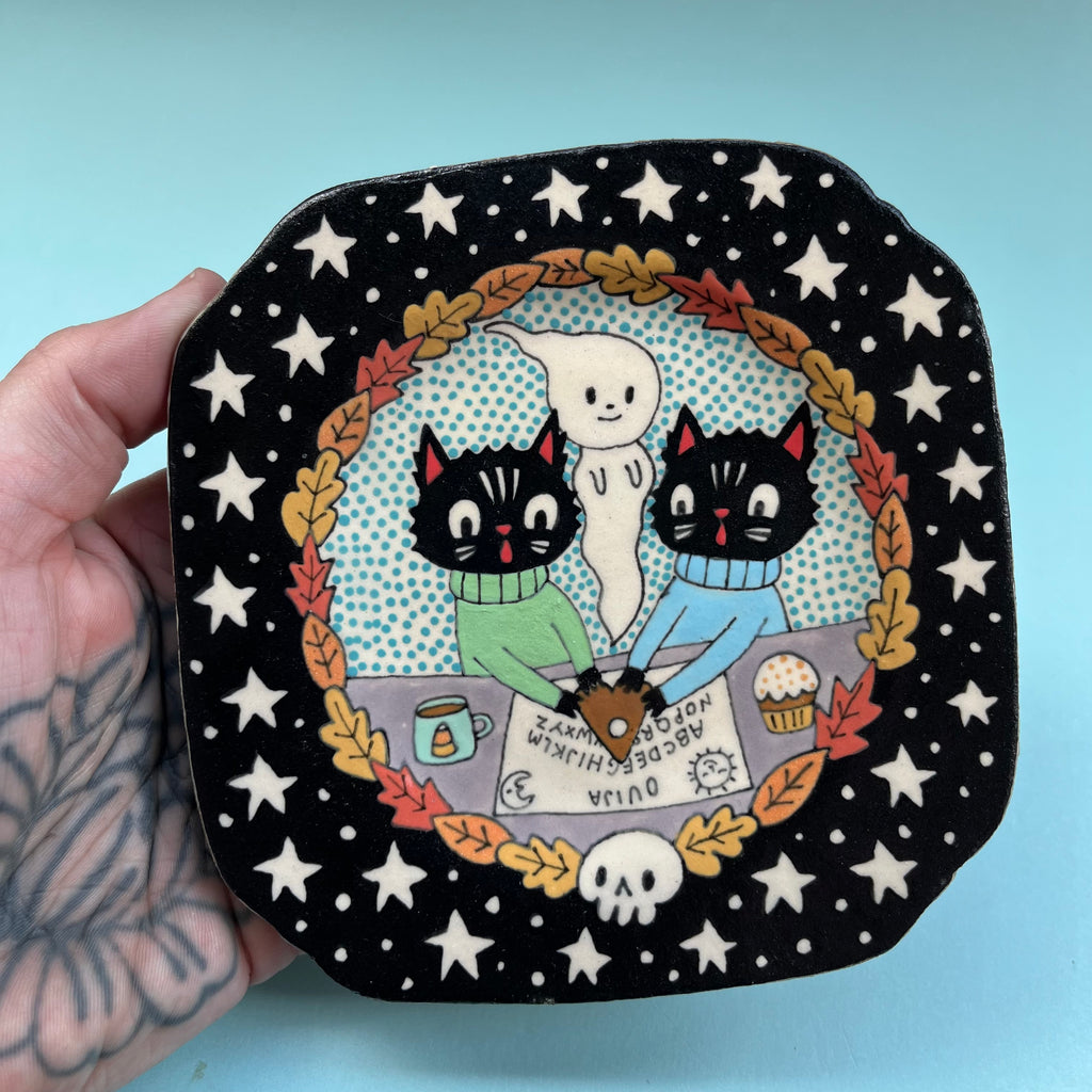 Hand built from stoneware clay and hand painted with underglazes and glaze.