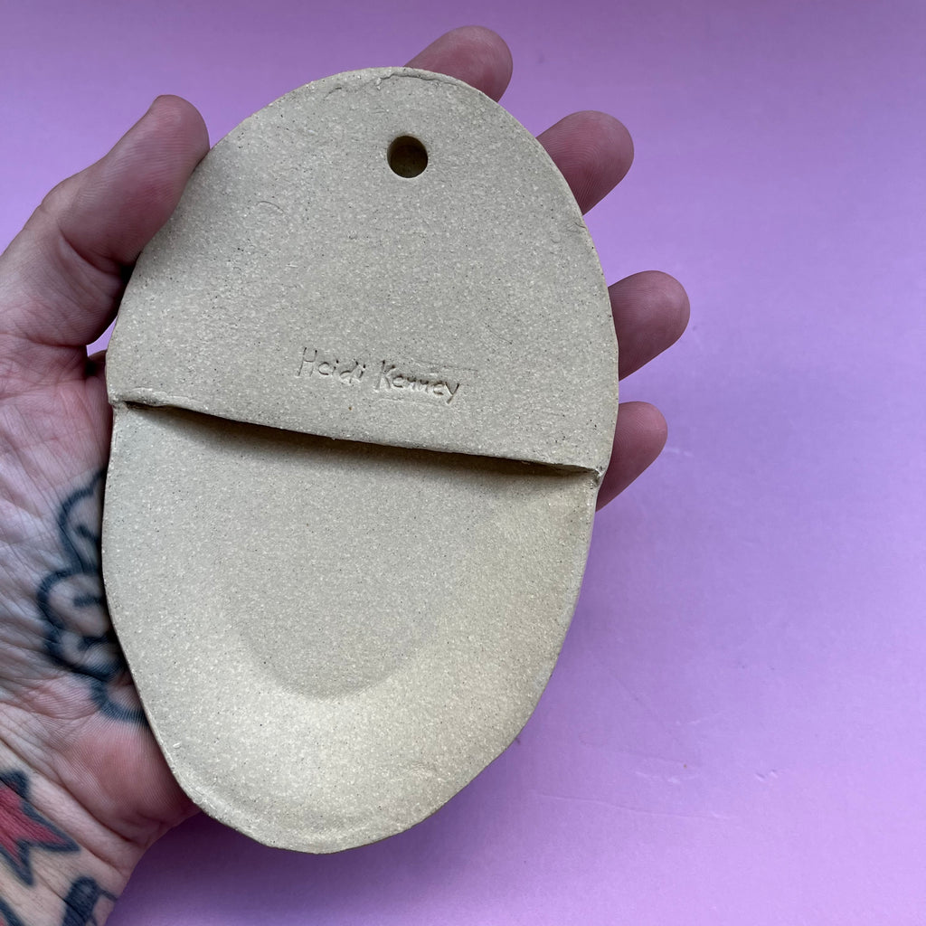 Hand built from stoneware clay and hand painted with underglazes and glaze.