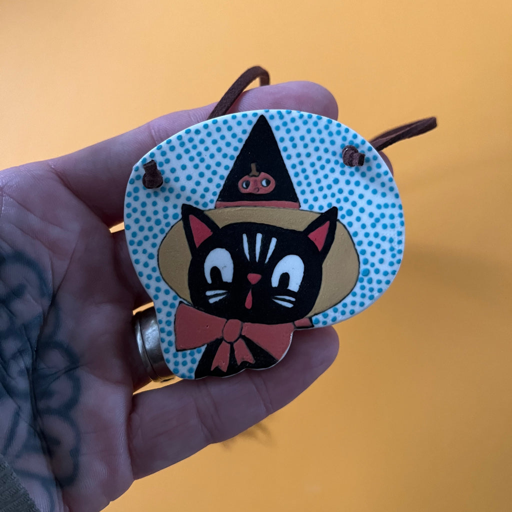 Hand built from stoneware clay, and hand painted, glazed and fired twice. Strung on faux leather necklace about 20" long and ready to wear