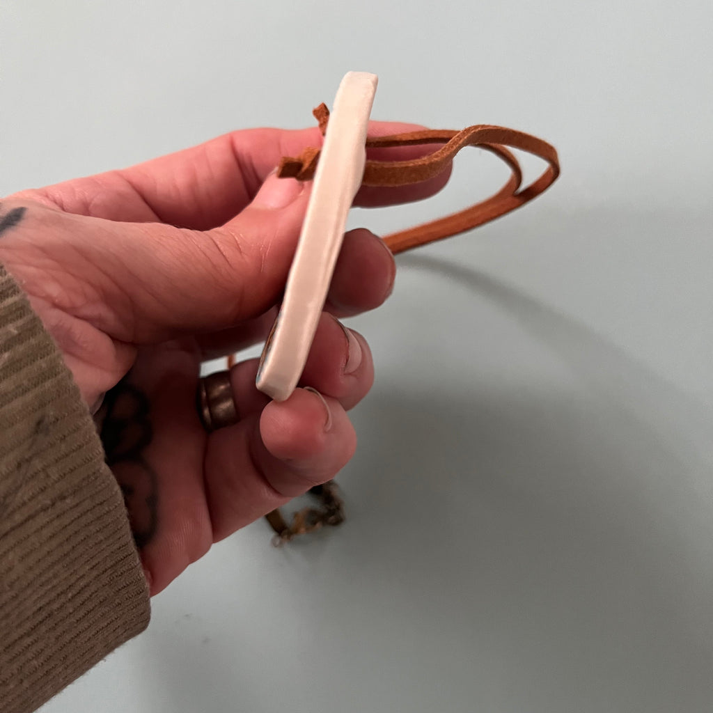 Hand built from stoneware clay, and hand painted, glazed and fired twice. Strung on faux leather necklace about 20" long and ready to wear