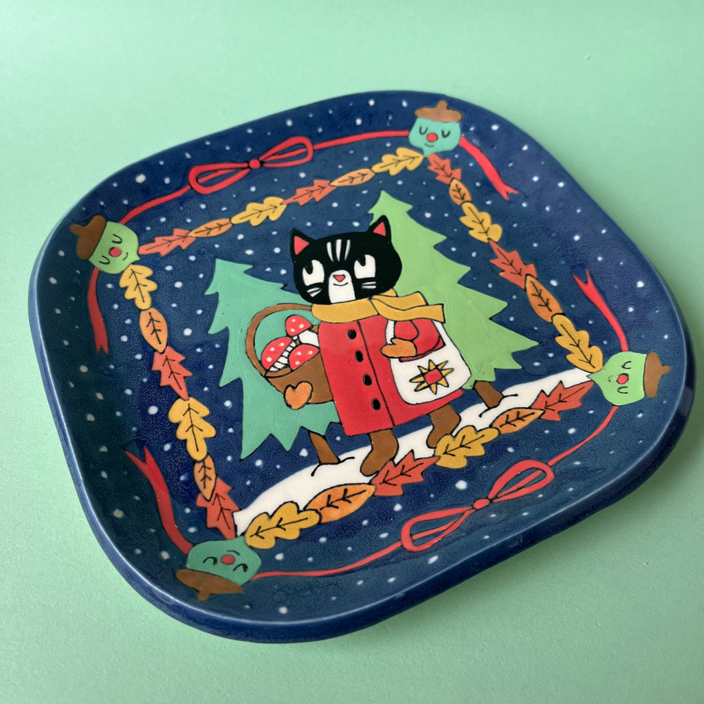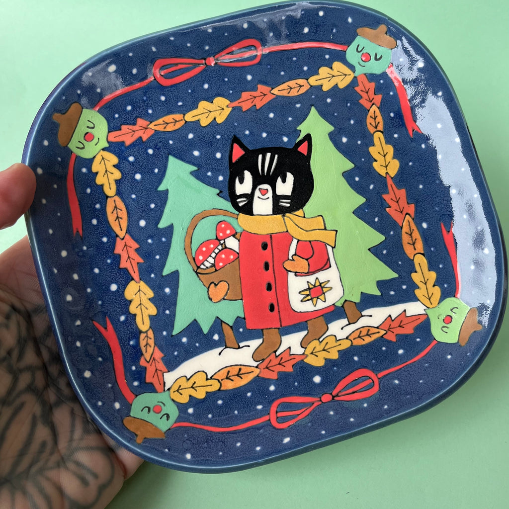 Ceramic Hand Built Cat In Winter Plate 6.25"