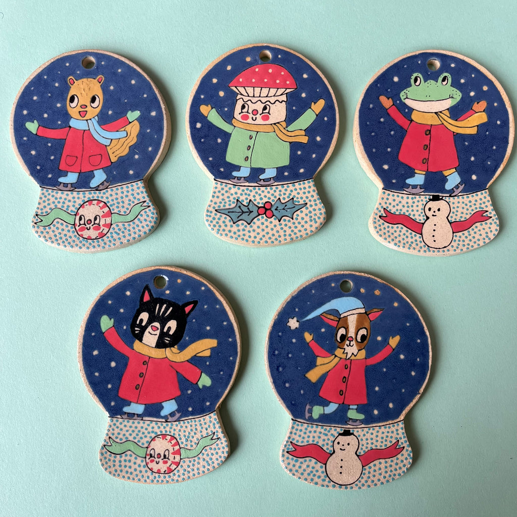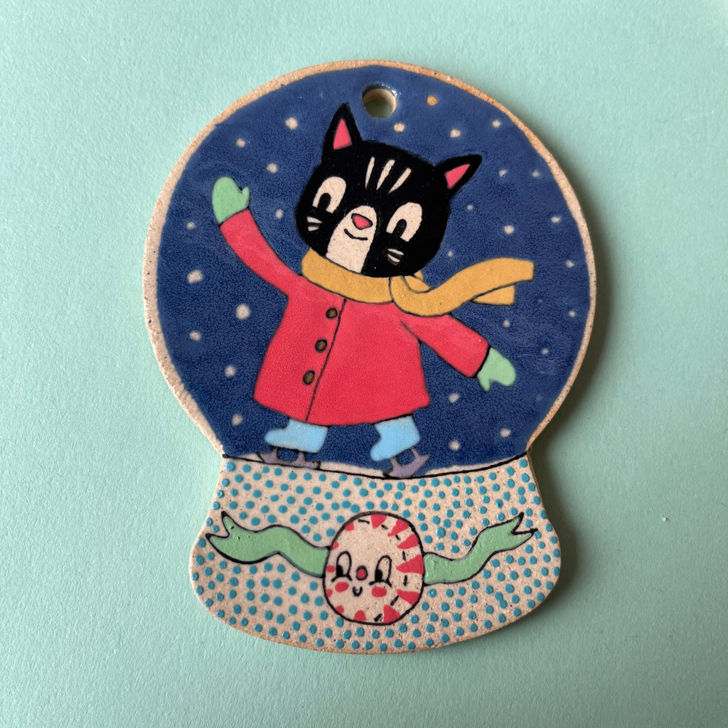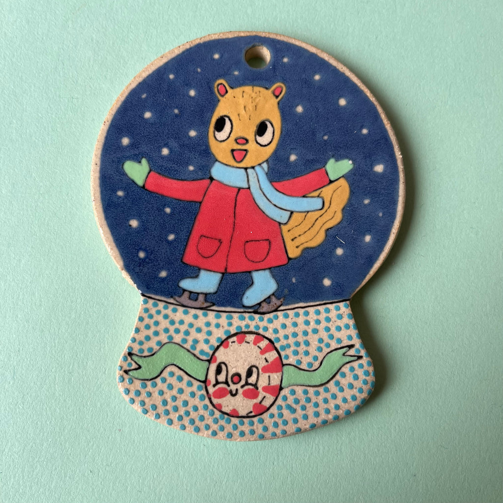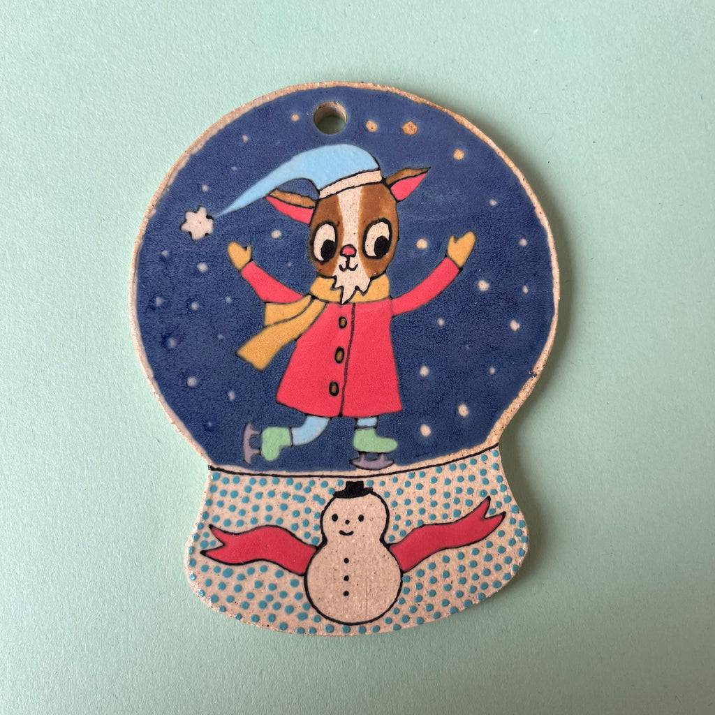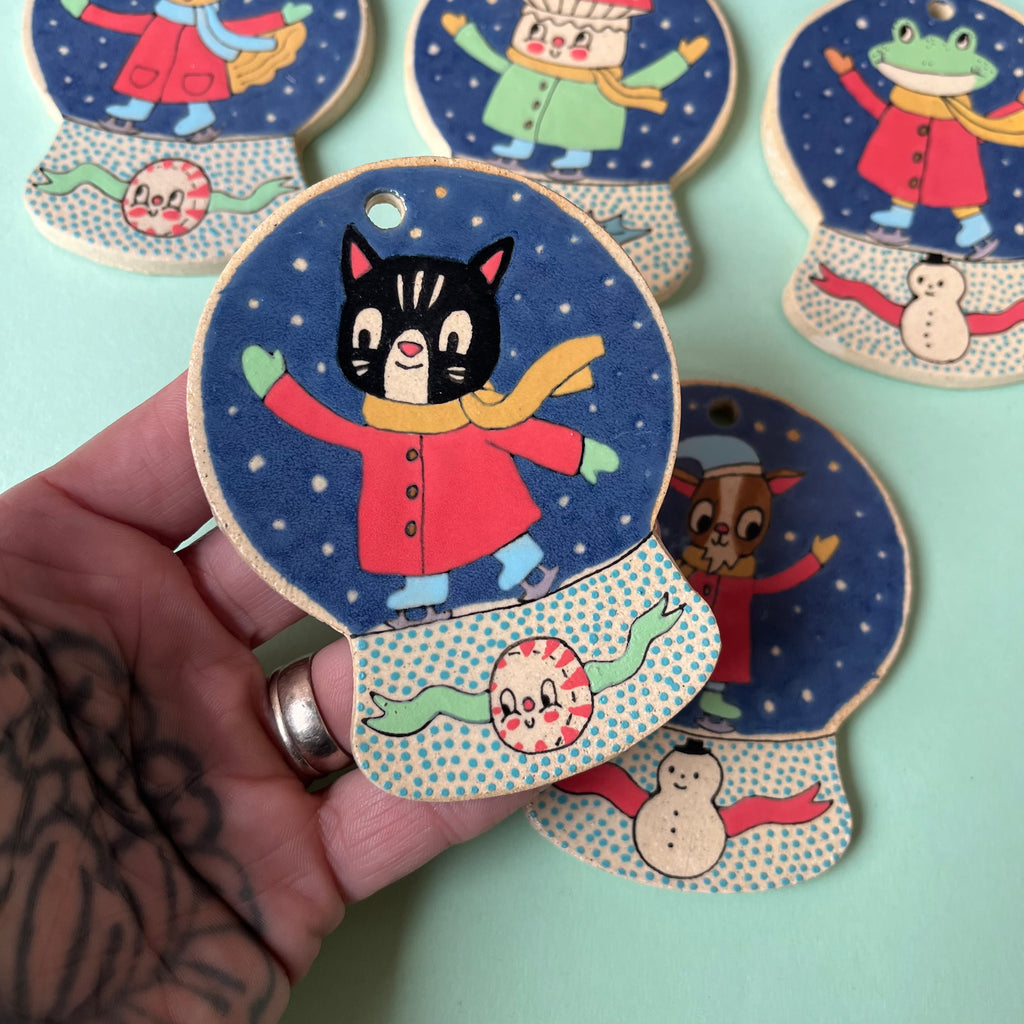 Ceramic Hand Built Ice Skaters Snow Globe Ornament