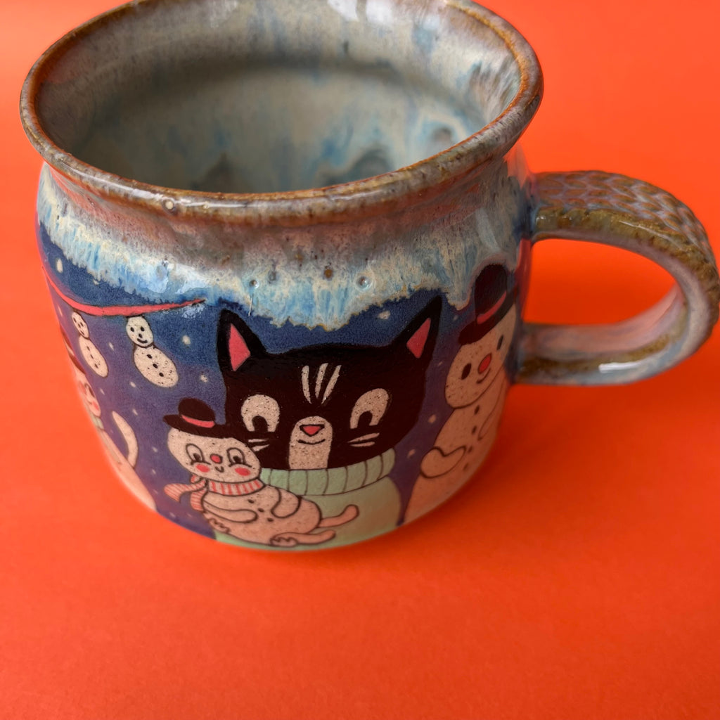 Ceramic Wheel Thrown Cat Snowman Mug 11oz