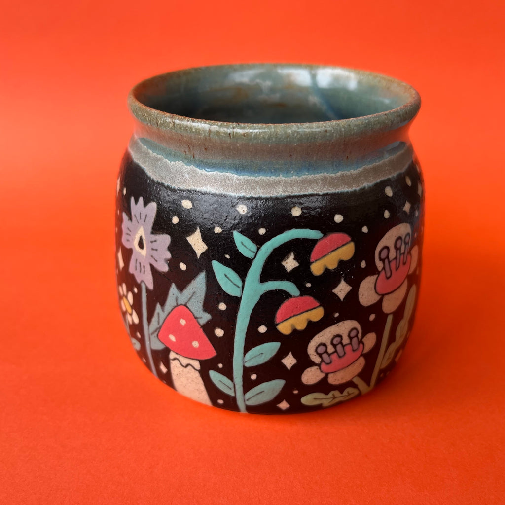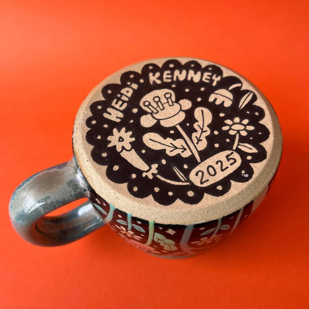 Wheel thrown from stoneware clay and hand painted with underglazes and glaze.