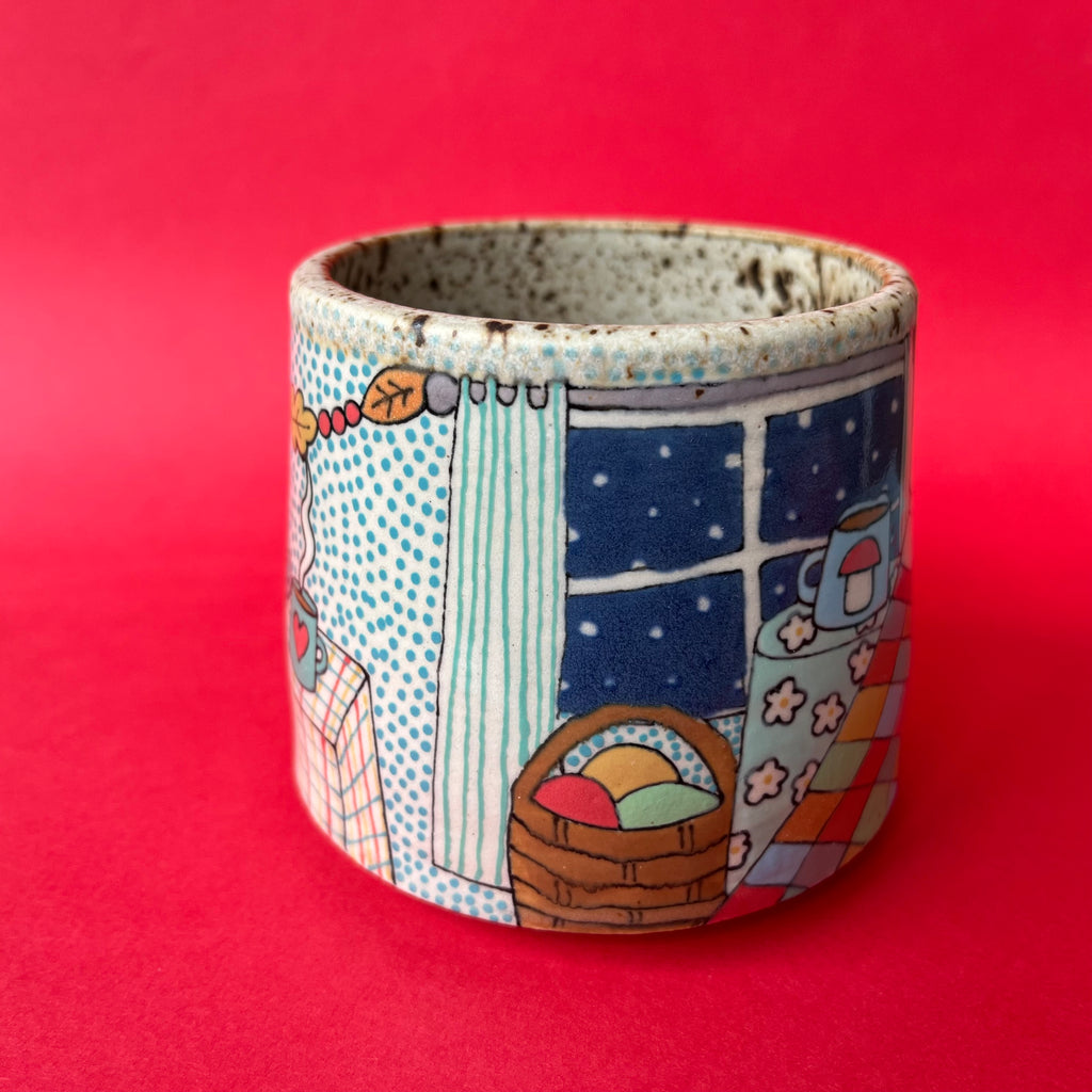 Wheel thrown from stoneware clay and hand painted with underglazes and glaze.
