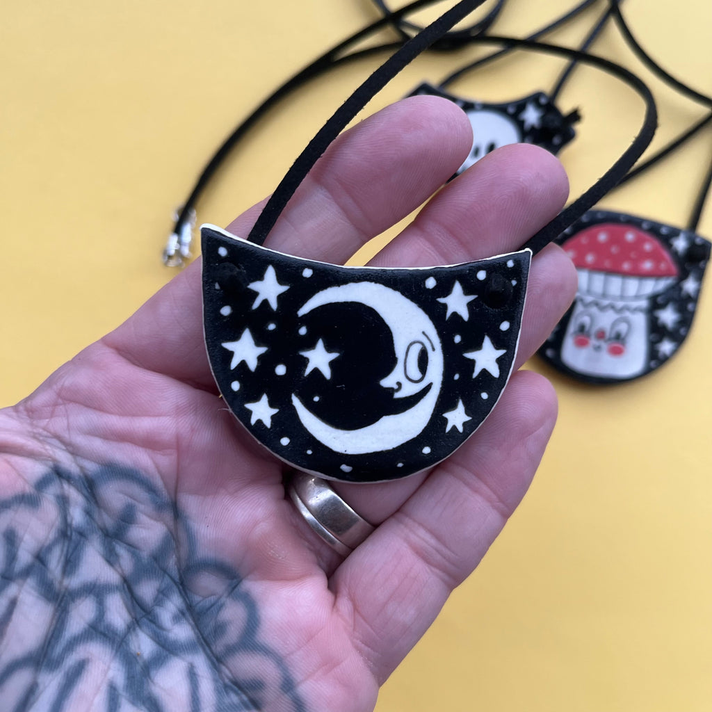Ceramic Hand Built Necklace Moon, Skull, Mushroom