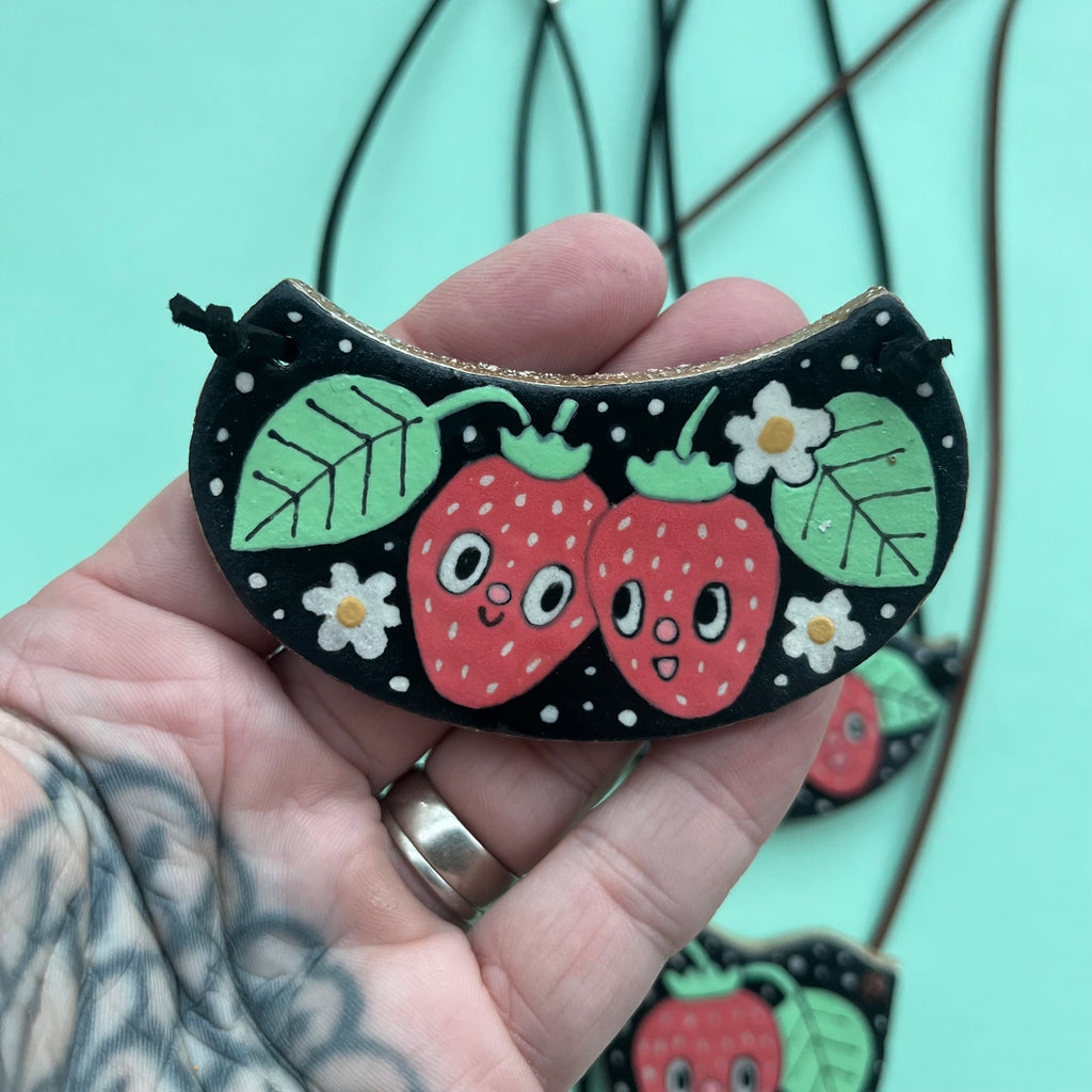 Hand built from stoneware clay, and hand painted, glazed and fired twice. Strung on faux leather necklace about 22" long and ready to wear