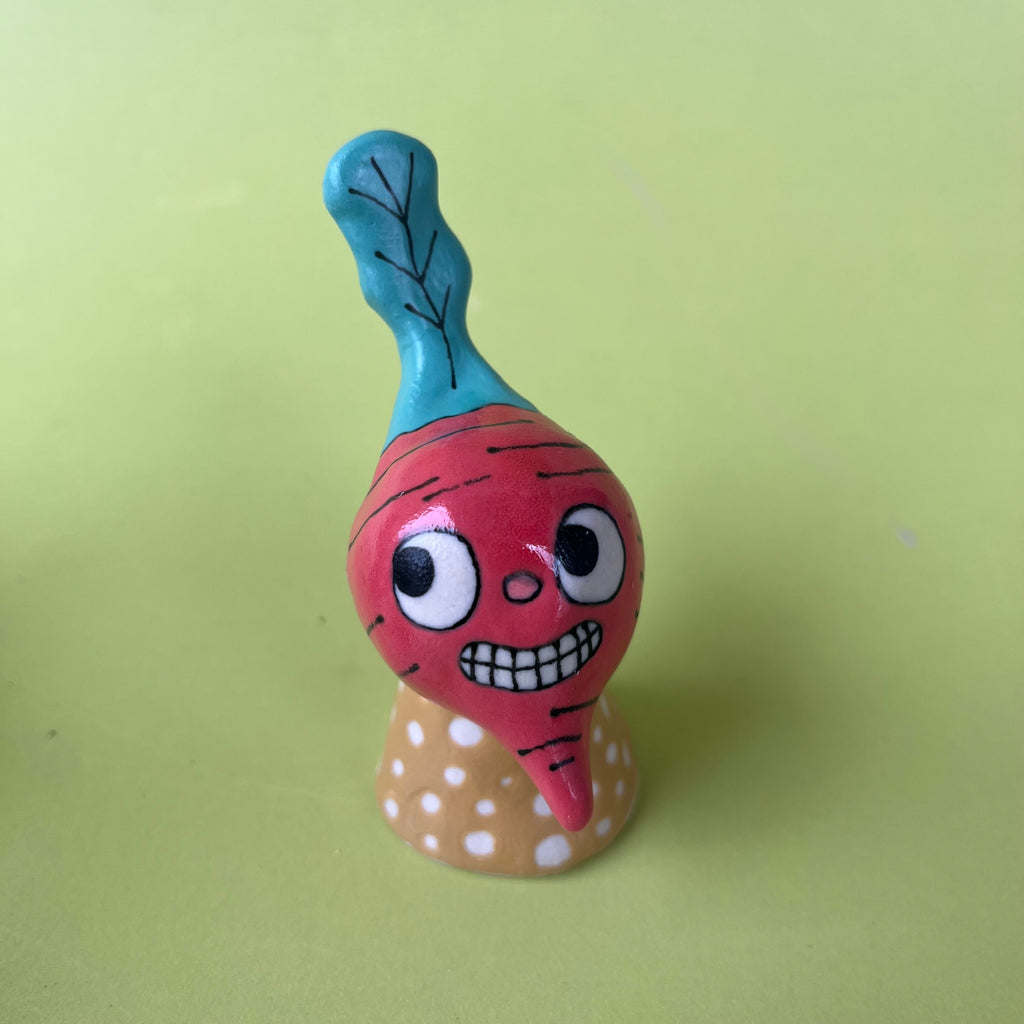 Hand built from porcelain clay and painted with underglazes and glaze.